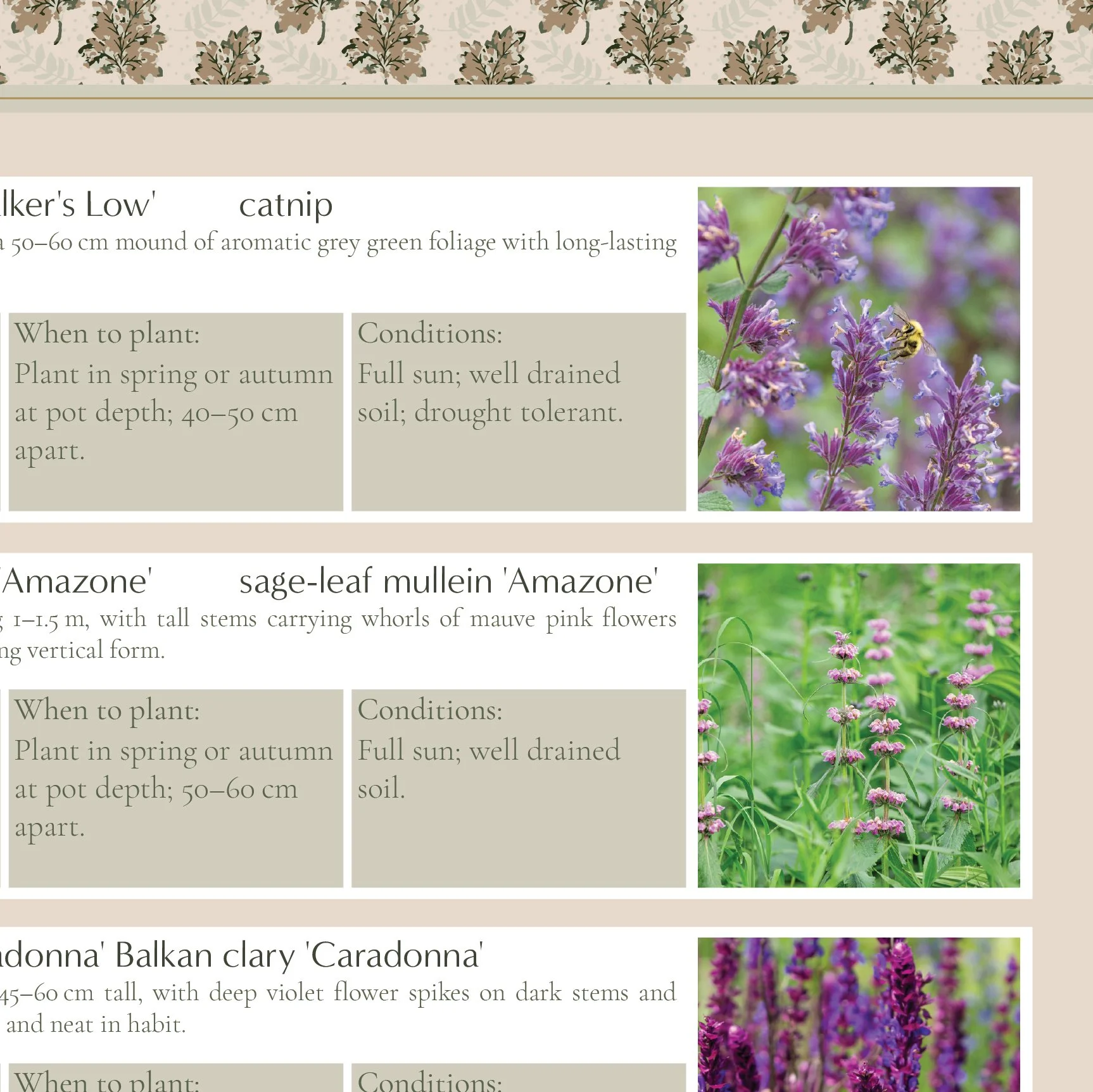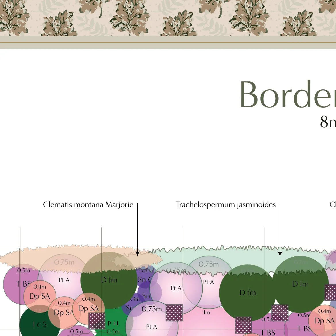 Design for a 8m x 2m/3m space. 15 page PDF containing palette, design, matrix, care guide and buying list. Available on Etsy HERE